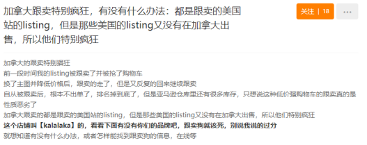 此外,还有卖家爆料称加拿大跟卖特别疯狂,都是跟卖的美国站的listing。