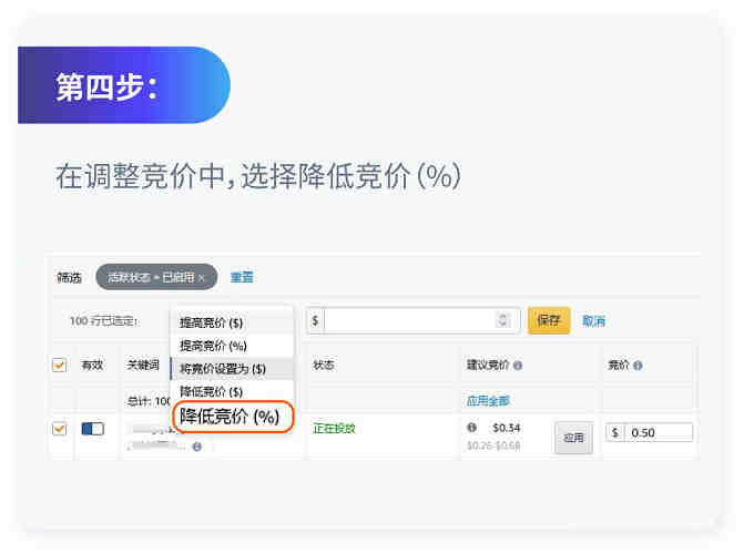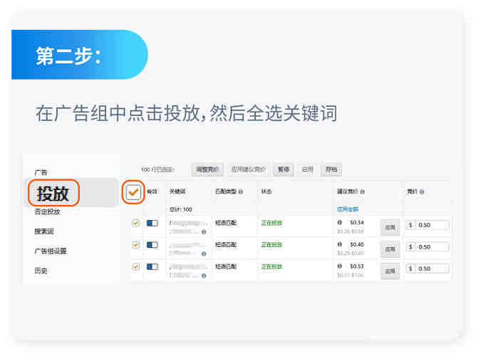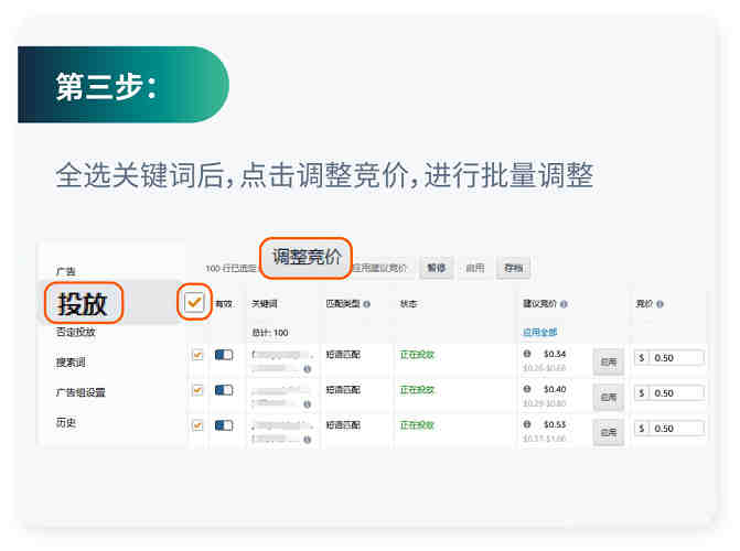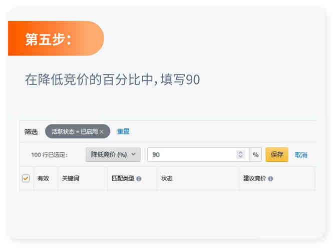同理,假设美国时间5时后,某个商品的出单将逐渐增多,此时我们需要将广告恢复到原位置竞价,我们可通过以下四步: