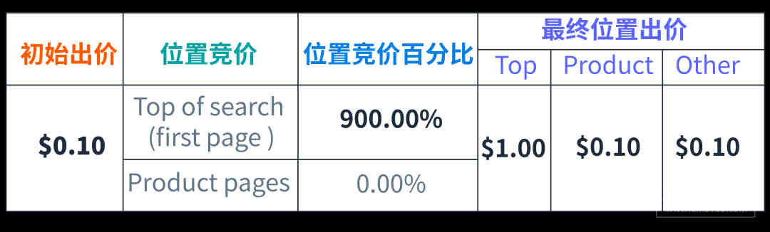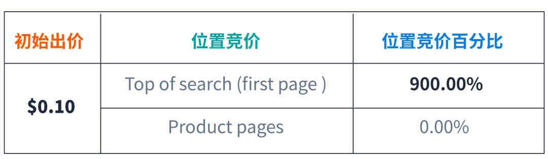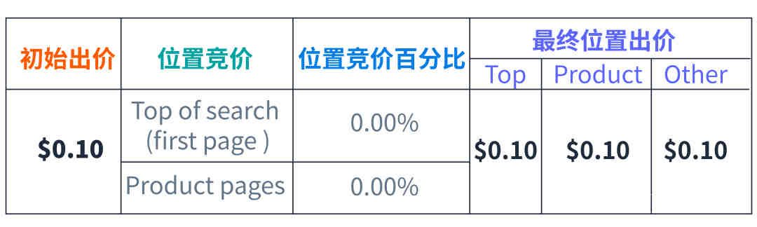 第二步,我们减少初始出价(可按10倍缩小)至0.1美金,此时,三个位置的出价将等比缩小为0.1美金。