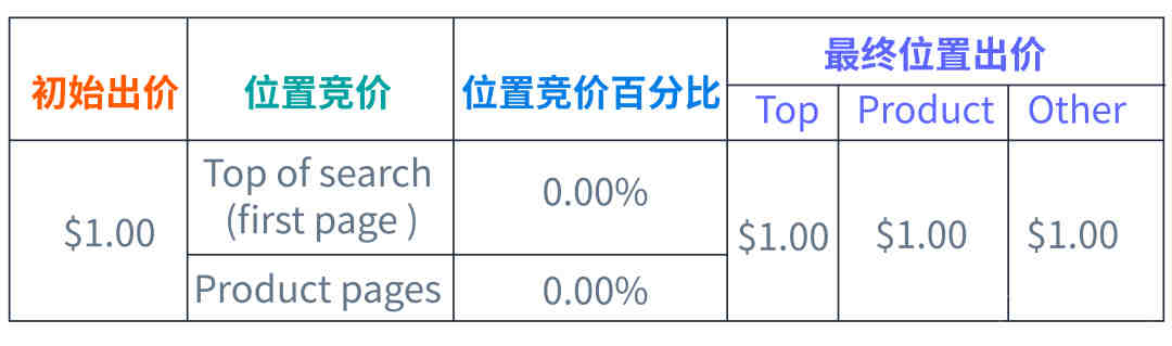 首先,我们为某个广告活动的关键词设置了1美金的出价,且不针对任何位置进行竞价百分比调整,此时,三个位置的最终位置出价均为1美金。