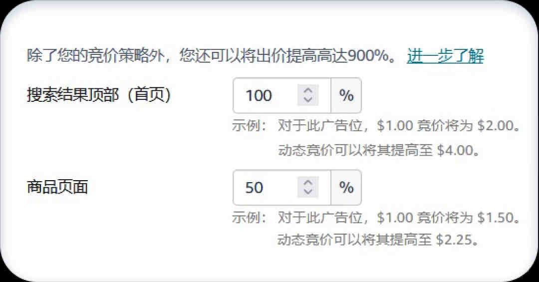 第三步,我们针对想要的搜索结果顶部位置设置最大的竞价百分比调整900%。