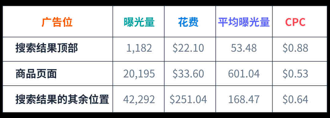 在开启广告位置竞价实操干货分享之前,我们先来复习一下,亚马逊不同广告位置的特点。以下是某个广告活动的后台数据: