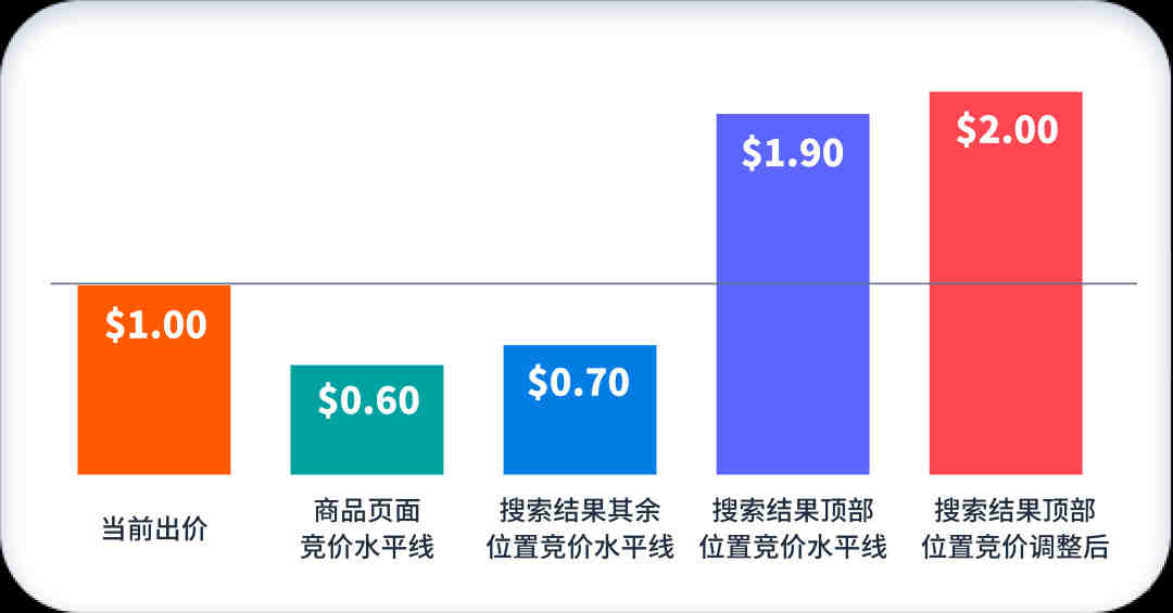但这样“直接粗暴”的竞价调整方式,往往会导致预算浪费的情况。举个例子,我们为某个广告活动中的关键词设置了1美金的出价,为了拿下想要的搜索结果顶部位置,我们针对该位置,直接设置了100%的加价提高。