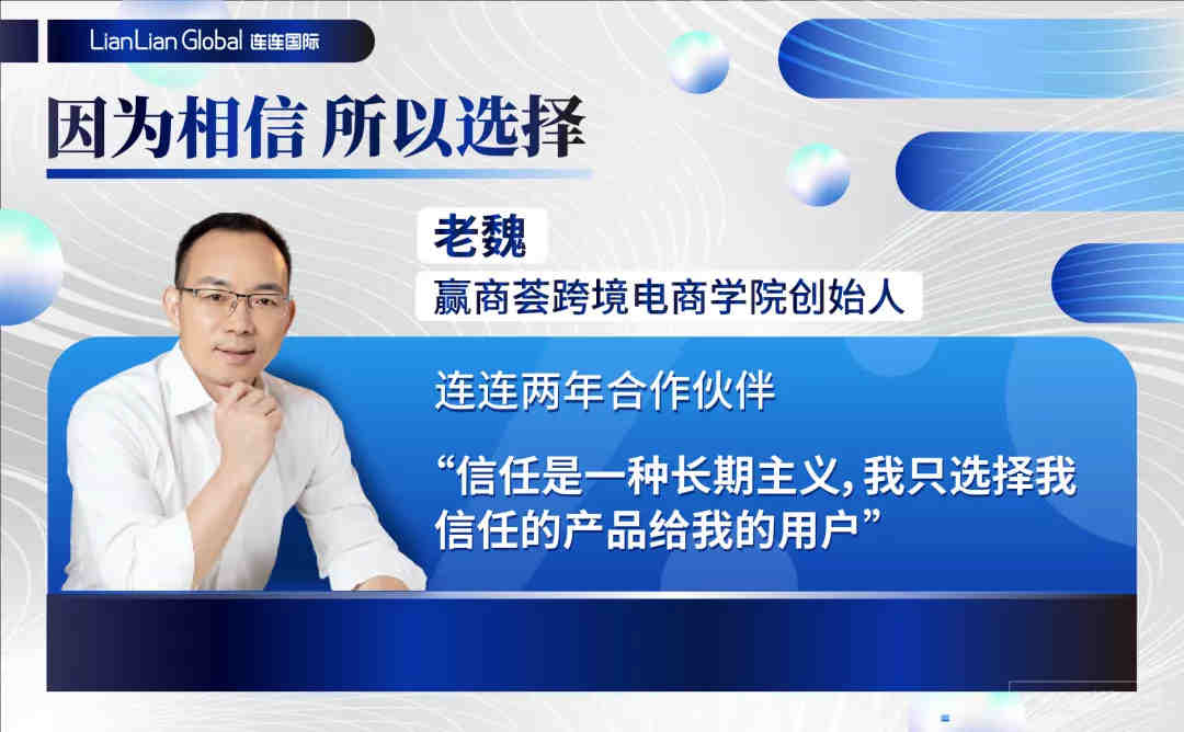 作为连连国际金牌导师中的一员,老魏早在2017年就认识了连连。“当时在各大跨境电商展会上都可以看到连连的身影,连连的小伙伴也常常来找我探讨跨境行业,一来二去,我和连连就成为朋友了。”