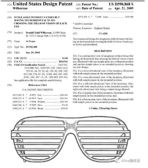 该美国外观专利D590868,于2009年4月申请注册美国外观专利保护年限为15年,预计于2023年到期图1为该专利的左侧图,可以看出新设计图2,图3为该专利的正面图两个镜腿脚都是前伸出的的状态图五为该专利额右侧图,可以看出新设计