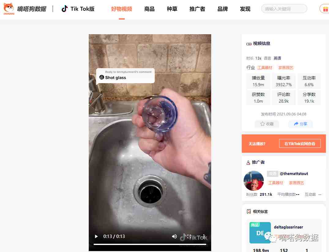 在关键词Glass Rinser中发现了这个名为@themattstout的账号,过去一年中,发布了很多关于清洗器的视频回应网友的问题,目前在TiKTok上拥有40万粉丝,获得了1800万点赞。