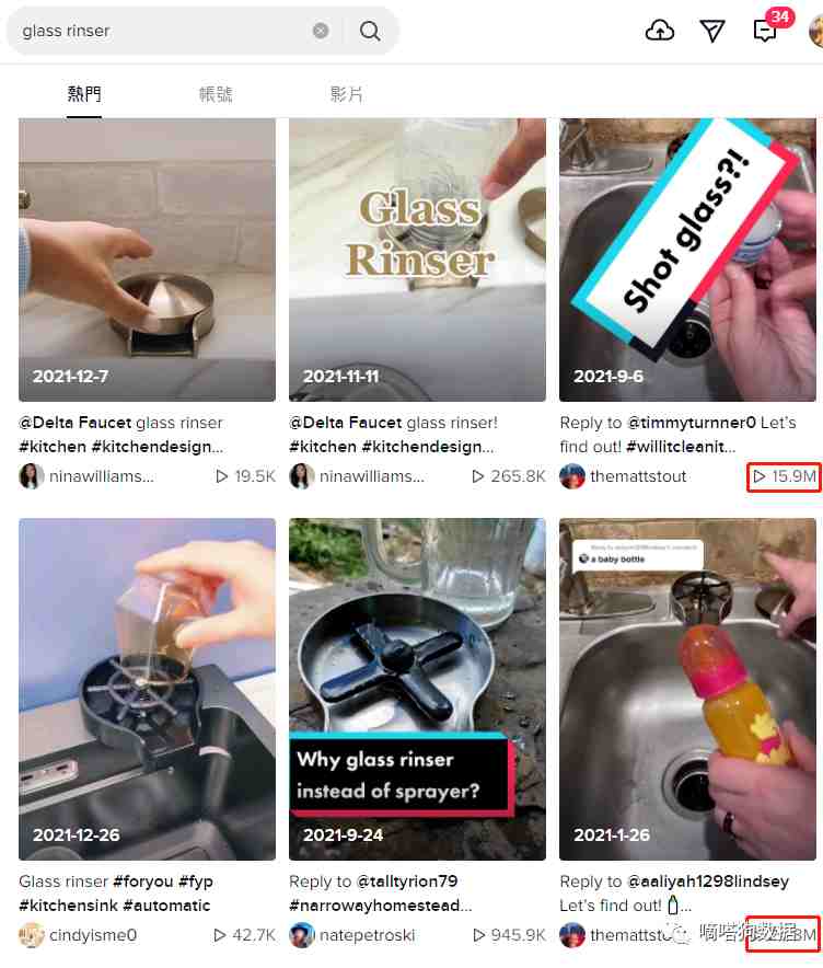 除了标签有很高的热度之外,在TikTok上用关键词“Glass Rinser”搜索,也会出现很多分享“水杯清洗器”的视频。在9-6发布的视频获得了1500万的播放,1-26发布的视频超过了2400万播放。