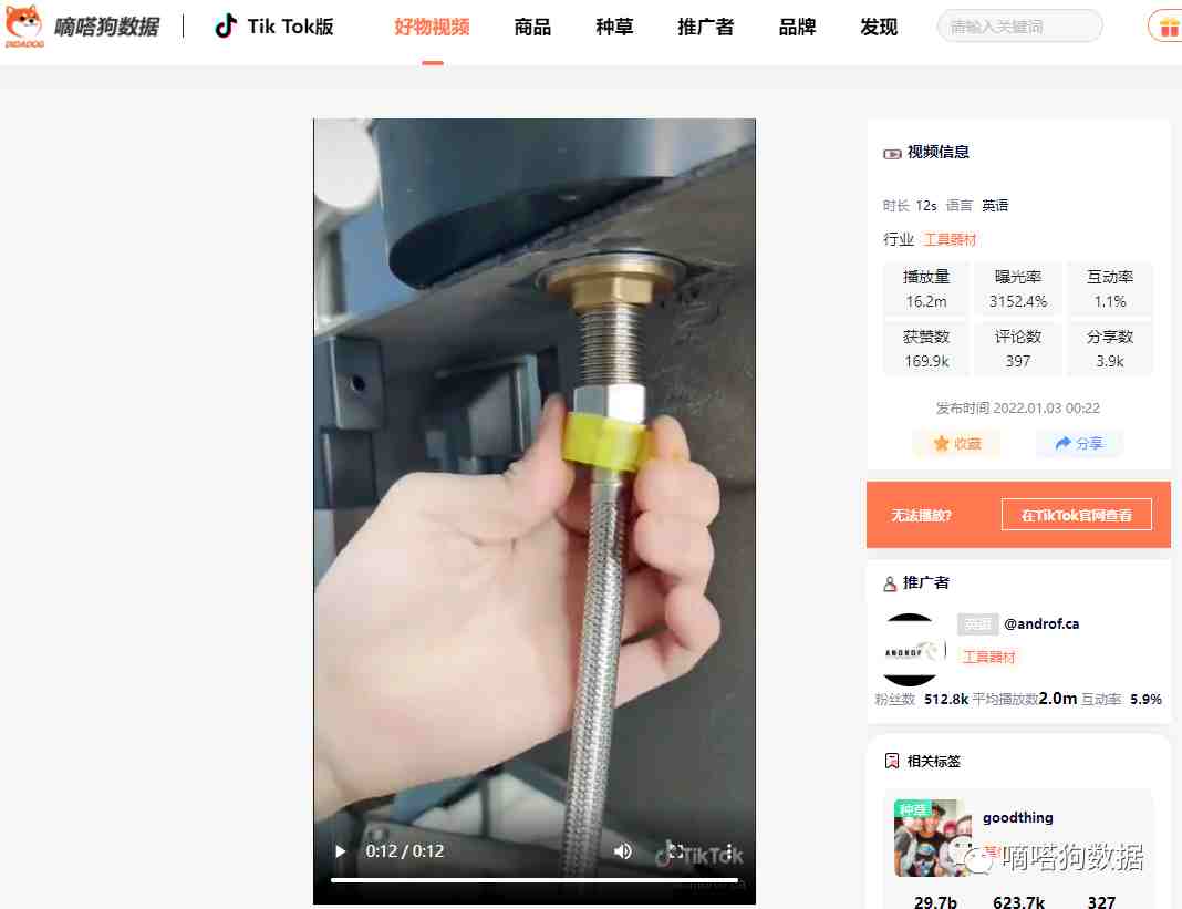 除了@themattstout在9月份有一条爆火视频外,拔拔通过嘀嗒狗数据发现了一位TikTok博主@androf.ca在2022年1月份发布的视频,也获得了很高的热度。