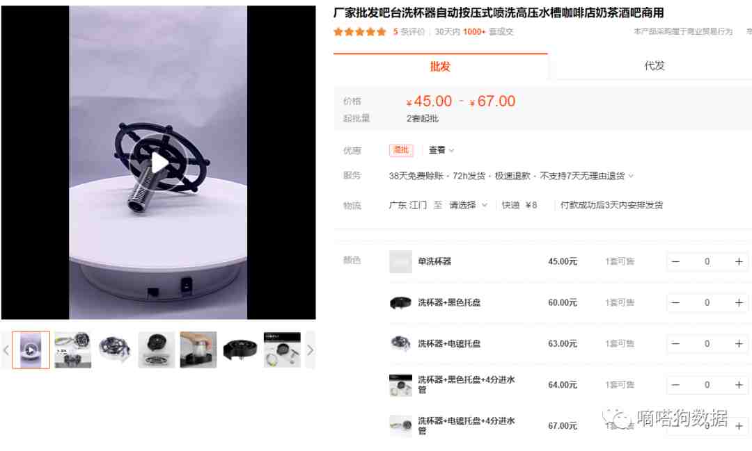 “Glass Rinser水杯清洗器”在国内的1688上有很多卖家在售卖,价格为45元。其中有商家在30天内售出1000+的订单,成交额为6万元。