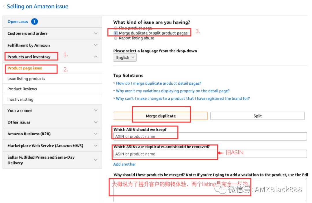 2. 合并新旧两个ASIN,如下图开case合并,保留新的ASIN,移除旧的ASIN