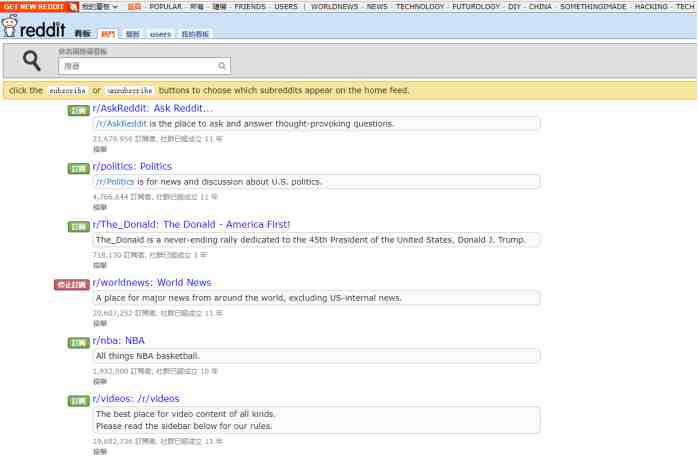 通过搜索关键词会出现很多subreddit, 你可以根据你的行业,你的专业,你的兴趣添加一些subreddit,subreddit里都有关注人数,尽量找那些较多一点的subreddit关注。当然你也可以进入总的subreddit页面寻找自己喜欢的话题: https://www.reddit.com/subreddits