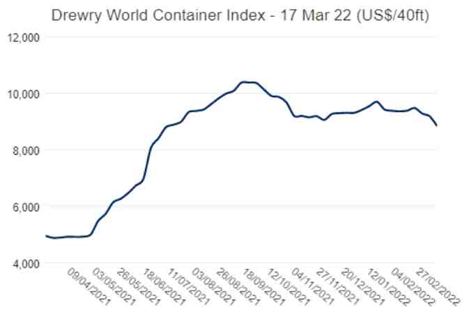 而最近的一个月内,上海港出口至欧洲市场运价,从7677美元/TEU下跌到7019美元/TEU,跌幅超过8%;上海港出口至地中海的市场运价也下跌了近5%左右。而世界集装箱运价综合指数——德鲁里指数也在最近跌到8,832.23美金/FEU,这是自2021年7月29日以来,德鲁里指数首次跌破9000美金/FEU。