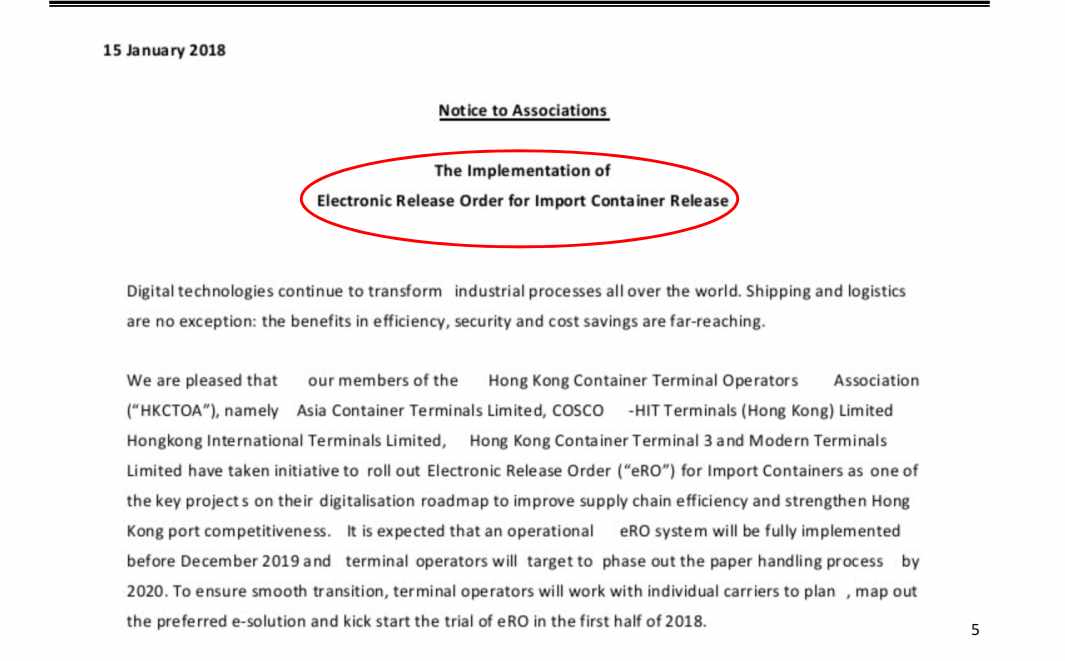 eRO (electronic Release Order) 即电子提柜单。透过电子提柜单服务平台,船公司可以发送电子提柜指令给入口货主或其代理(包括货运代理及货主代理) ,到货柜码头,提取入口货柜。