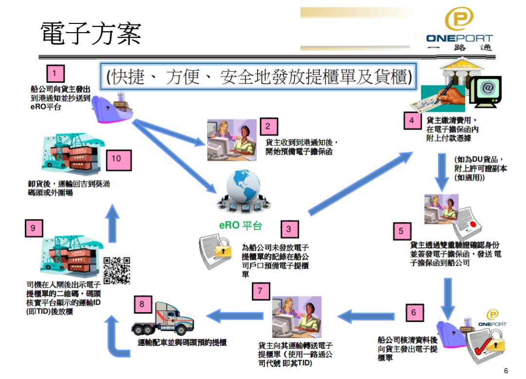 电子提柜单服务平台上,船公司、货主及其委托代理、货运代理等可以处理所需的入口提柜文件及费用﹔及电子提柜单的发送、接收、货柜码头提重、外围场回吉等入口流程步骤。有了电子提柜单服务平台,货主及代理们再无需递送纸张文件到船公司的服务台。有关的入口文件及费用,经船公司在平台上核实后,电子提柜单便会在平台上直接发送到货主或代理的户口﹔电子提柜单的拥有者,亦可继续在平台上安全地传送提柜单到另一方。当货柜运输收到货主传送过来的电子提柜单后,必须于提柜单上指派提柜车牌,在提柜时经码头核实,仓期未逾才能成功提柜离去。在回吉到外围场时,回吉地点及有效仓期亦需核实,才完成整个入口货柜处理程序。