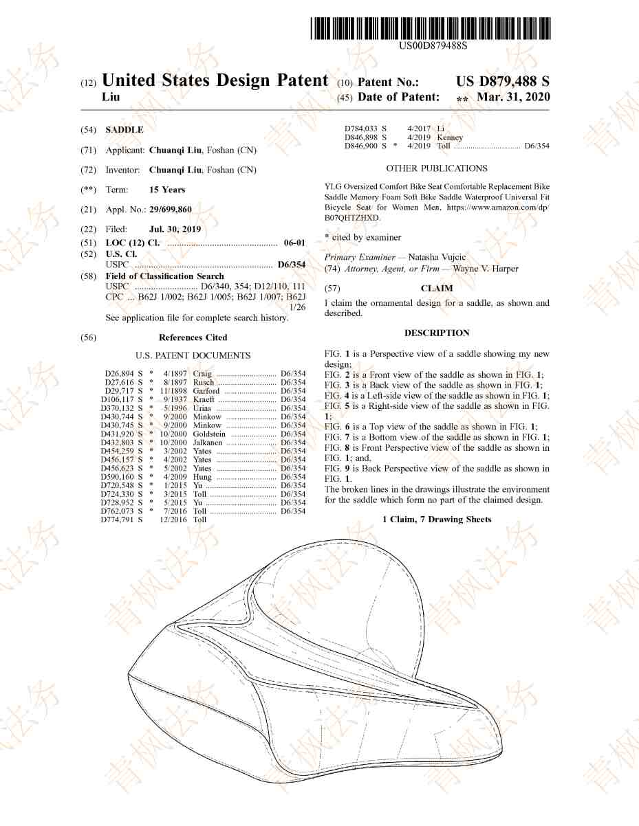 原告专利:自行车车座外观专利,专利于2020年3月31日下证