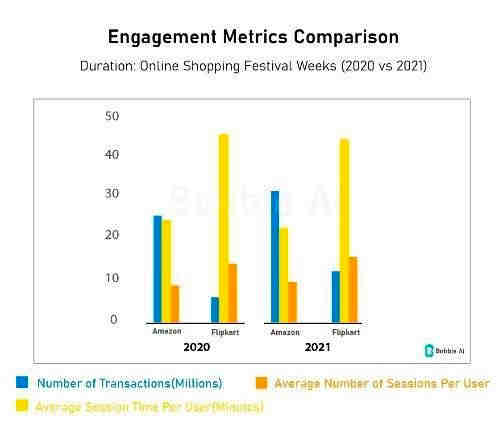 亚马逊和Flipkart也值得关注,在2021年网购节中,Flipkart的活跃用户群上升了83%,而亚马逊的活跃用户群为72%。尽管Flipkart在搜索频率和活跃会话等参与度指标方面占据优势,但亚马逊在交易量方面获胜,尽管会话时间明显少于平均值。