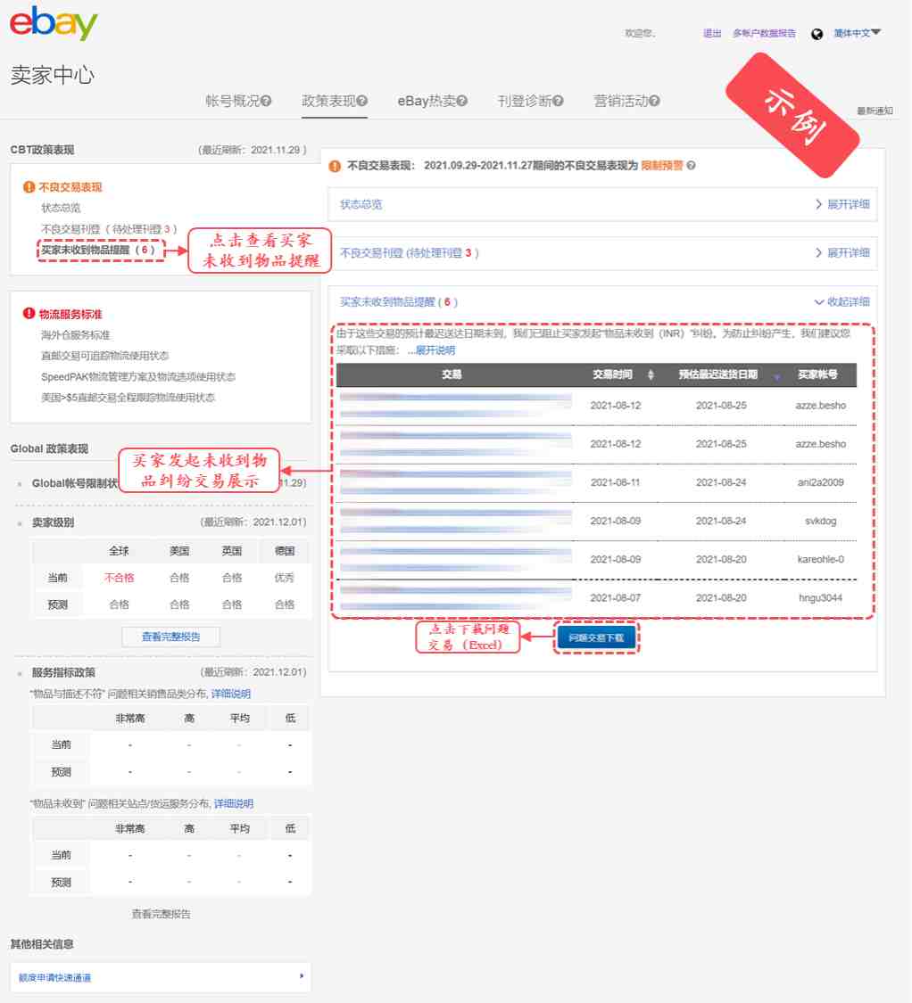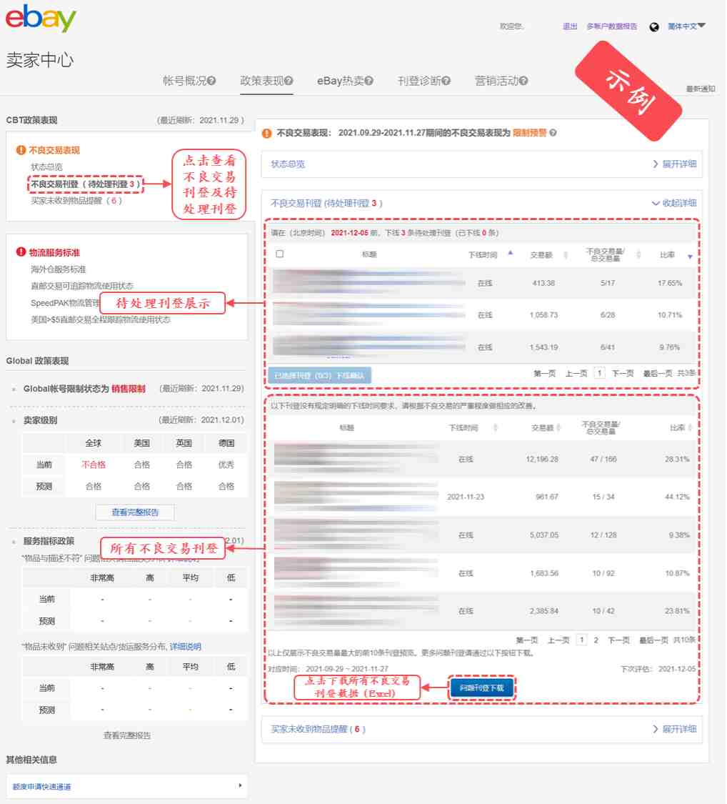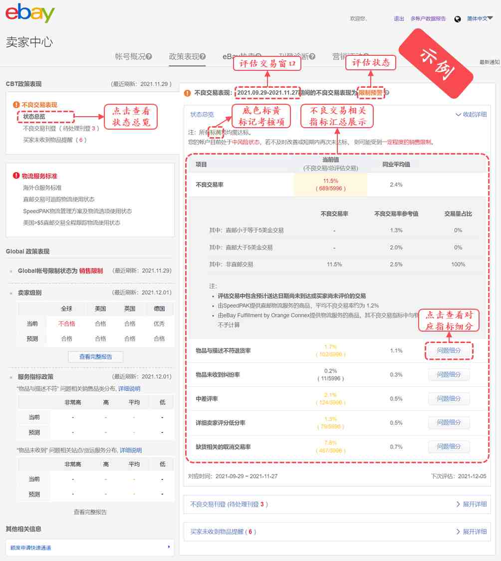 一直以来,eBay致力于为全球买家提供优质的购物体验。为进一步提高平台的综合购物体验,eBay于近期做出调整,加大了帐号层面的不良交易指标对流量分配的影响☞立即行动,改善帐号不良购买体验,斩获更多流量!。鉴于此,从2021年12月8日开始,eBay将简化大中华区不良交易相关管理政策,并全面更新卖家中心政策板块,以便让卖家更好地了解并追踪其帐号的不良交易表现情况。