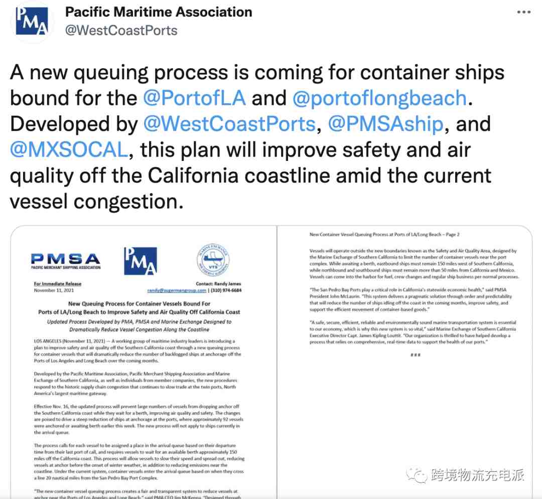 美国太平洋海事协会(PMA)今早凌晨发布了一则重磅消息(如下图):从 2021年 11 月 16 日开始,要求从太平洋彼岸抵达的入境集装箱船需要在距离南加州海岸约 150 英里(约等于242公里)的可用泊位进行等待,而不是在指定的锚地或游荡区停泊。150 英里的边界仅适用于东行船舶,而北行/南行船舶必须与西海岸保持 50 英里(约等于80公里)以上的距离。