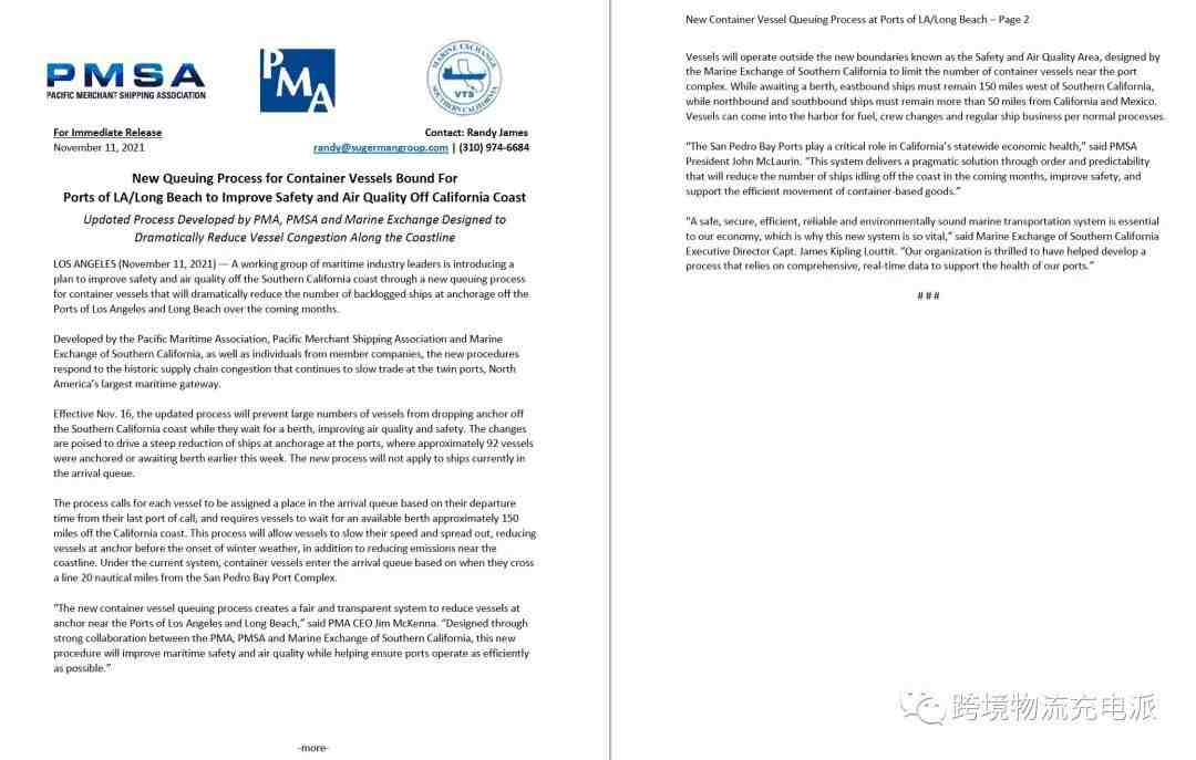 太平洋海事协会首席执行官 Jim McKenna 表示:“新的集装箱船舶排队流程创建了一个公平透明的系统,以减少在洛杉矶和长滩港口附近停泊的船舶。” “通过 PMA、PMSA 和南加州海洋交易所之间的密切合作设计,这一新程序将改善空气质量,同时帮助确保港口尽可能高效地运营。