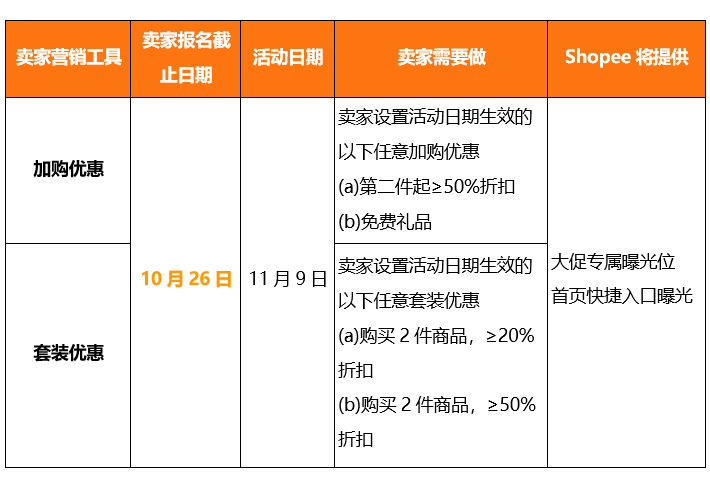 请收到客户经理邀请的卖家在10月26日前自行设置符合条件的加购优惠和套装优惠,并通过客户经理报名确认,即可获得曝光奖励: