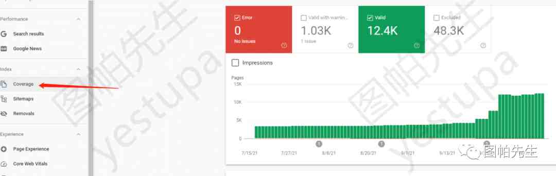可以在GSC (Google Search Console)里面的coverage看到网站有多少个页面已经被收录(valid)