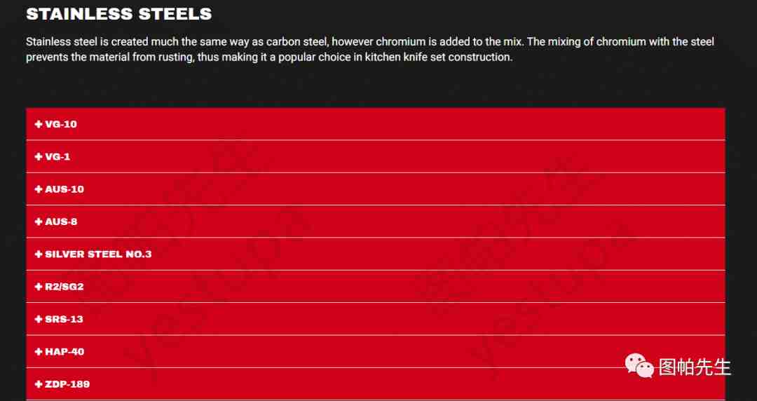比如这家刀具网站,就把所有不锈钢的种类列出来介绍了
