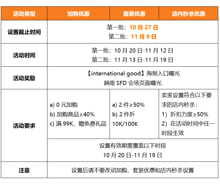 提报截止日期为10月19日,卖家向客户经理报名,同意Shopee代设置符合以下要求的店铺优惠券,即可获得奖励: