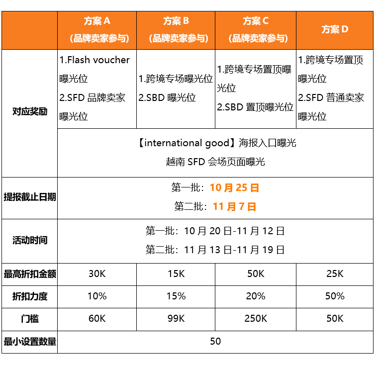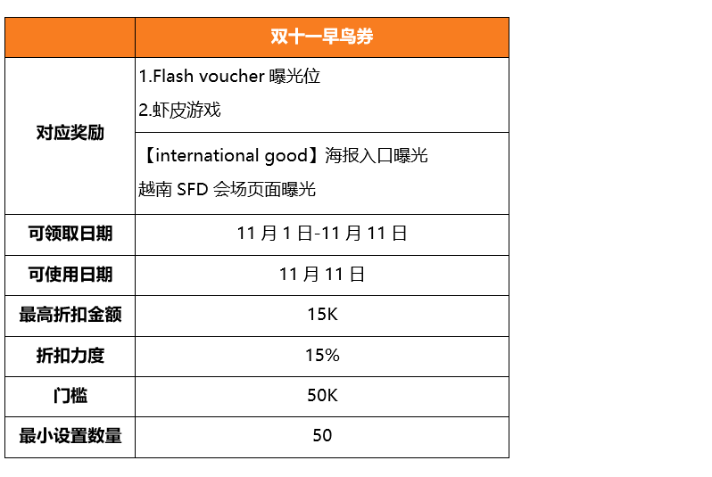 提报截止日期为11月7日,卖家向客户经理报名,同意Shopee代设置符合以下要求的店铺优惠券,即可获得奖励: