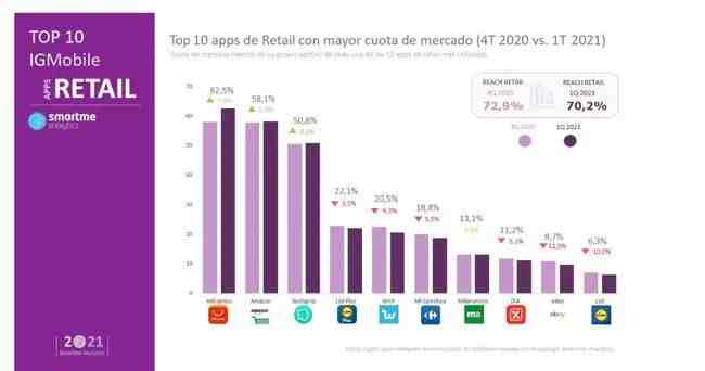 据Smartme Analytics发布的2021年第一季度西班牙购物APP分析报告中,对西班牙7000名智能手机用户的购物APP使用情况进行了调查,报告显示速卖通以62.5%的下载量成为西班牙最受欢迎的购物应用程序,同时也是增长最多的APP,下载量同比增长7.8%。
