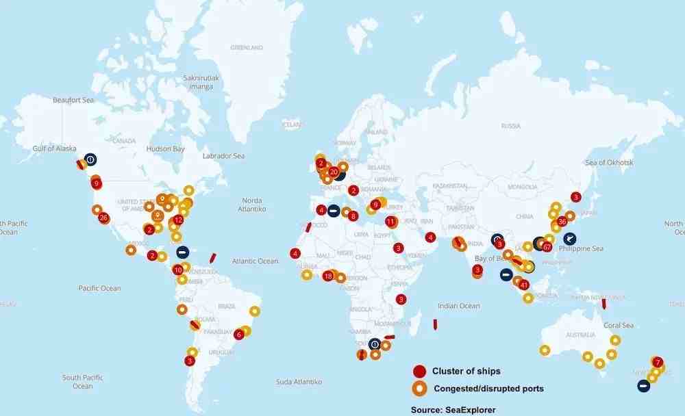 据德铁DB Schenker发布公告称,由于恶劣天气造成的破坏,北莱茵-威斯特法伦州和莱茵兰-普法尔茨州的众多铁路交通将出现延误和取消停靠。根据马士基的公告,比利时最近的天气状况对安特卫普和阿图斯之间的铁路轨道造成了严重破坏,因此,安特卫普至阿图斯之间的铁路已经暂时关闭,目前正在修复轨道,预计将持续至少三周。Rail CY and Rail Combined Athus港口拥堵蔓延至全球,五大洲越来越多的集装箱船在等待泊位停靠。物流巨头Kuehne+Nagel创建的集装箱运输平台seapexplorer发布的一张地图,突显了当前全球各集装箱港口超高压的场景。