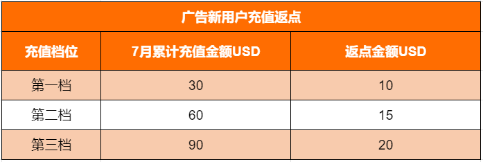 2021年7月1日之前从未进行广告充值的广告充值新用户在活动期间 (2021.07.01 - 07.31),在各个渠道进行广告充值且当月充值累计达任意档位要求,则可获得对应档位奖励,奖励以广告金的形式于2021年8月初发放至账户中。如累计充值金额在两个档位之间,则只能享受上一档位的单次奖励(例如在泰国站点月累计充值50美金,则仅获得10美金奖励)。