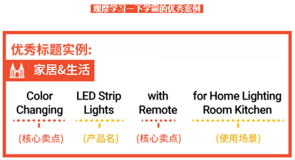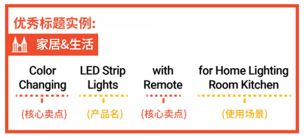 这个标题结构在家居生活、户外运动、汽摩配等品类应用更广泛,在顺序上您可根据市场语言习惯进行调整,如马来市场偏向将部分核心卖点信息/促销信息放首位。