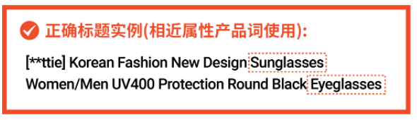 比如下图中,Sunglasses(太阳镜)、Eyeglasses(眼镜)为相近属性的产品词,当不同买家分别搜索这两个词时,都能找到该产品进行选购!可如果只有标题Sunglasses,那么搜索Eyeglasses的买家就很难搜到这个产品。