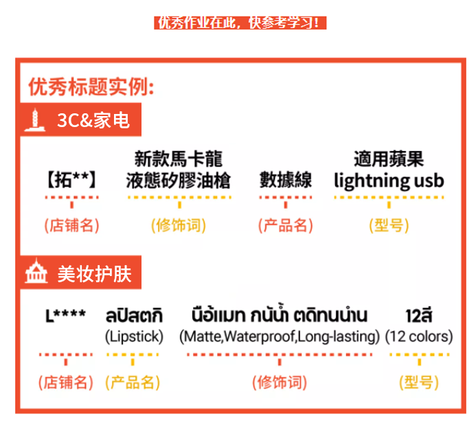 标准标题结构全市场、全品类都适用,但热销品大数据显示该结构在美妆护肤、3C电子等品类产品标题应用会更火爆。值得一提的是,泰国、越南等市场的小语种语言使用习惯为修饰词放在名词之后,所以您在写产品标题时可将修饰词后置以迎合当地语言习惯。