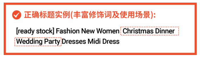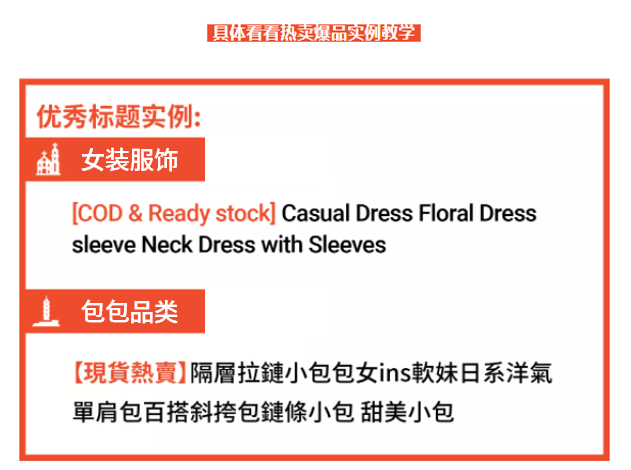 注意注意!标题除了热搜词和产品词之外,还有一类特殊关键词需要重点关注,往往一眼就能让买家决定是否立刻下单。“现货”、“ready stock”和“当天发货”等物流相关信息就是这类关键词。卖家可使用中括号“ [ ] ”将特殊词加在标题最前端,提高用户点击转化。