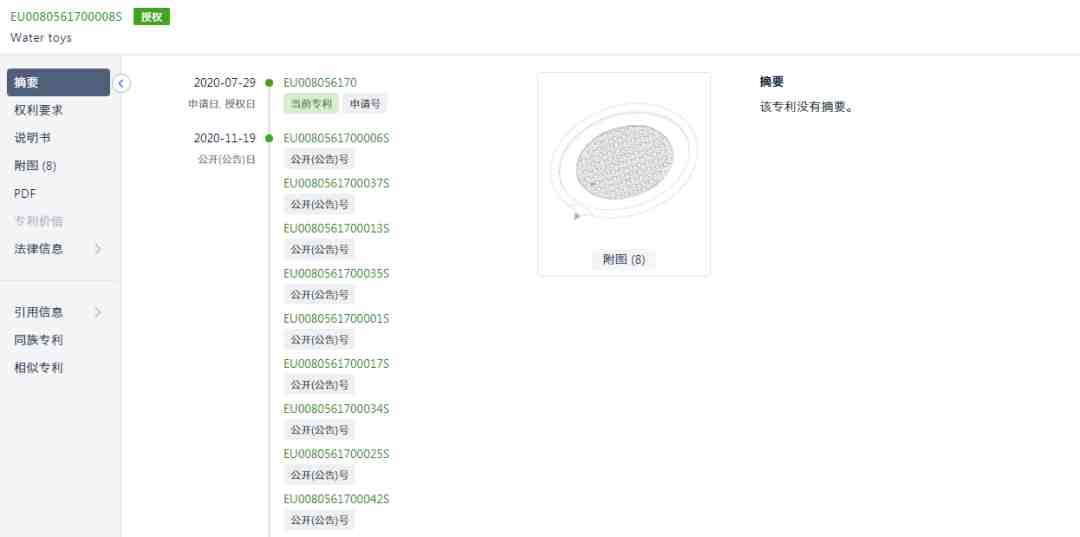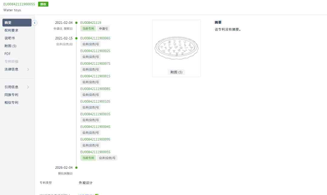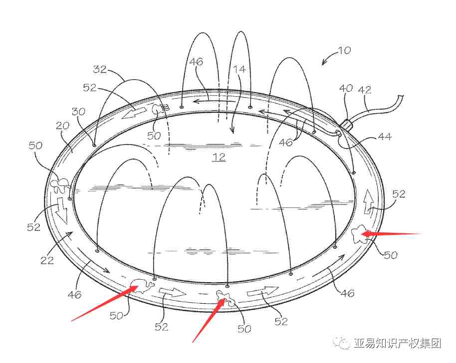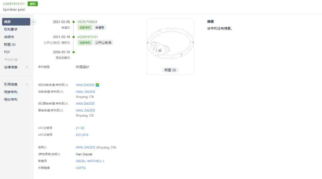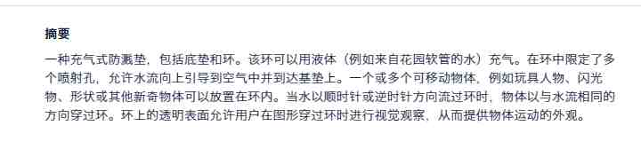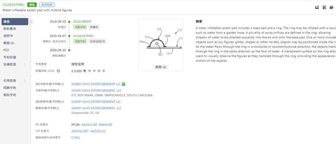以“Splash pad”或者“水上玩具”为关键词搜索,可以搜索到以下一款相关的美国发明专利 产品: