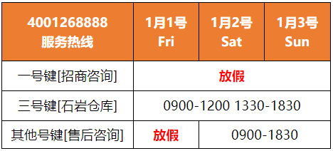 其他号键[售后咨询] 1月1号 放假 1月2号-1月3号 0900-1830