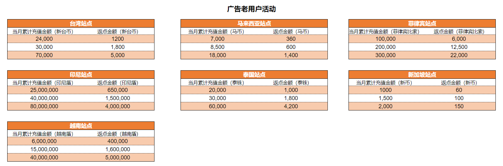 广告老用户在活动期间(2021.01.1 - 01.31),累计充值金额达任意档位要求,则可获得对应档位奖励,奖励以广告金的形式于21年2月月初发放至账户中。如当月累计充值金额在两个档位之间,则只能享受上一档位的奖励(例如,您在泰国站点当月累计充值50,000泰铢,则仅获得1800泰铢奖励金)。