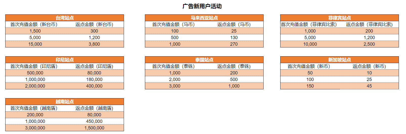 从未使用过广告的广告新用户在活动期间 (2021.01.1 - 01.31),广告首笔充值达任意档位要求,则可获得对应档位奖励,奖励以广告金的形式于2021年2月月初发放至账户中。如首笔充值金额在两个档位之间,则只能享受上一档位的单次奖励(例如在泰国站点首笔充值2500泰铢,则仅获得500泰铢奖励)。