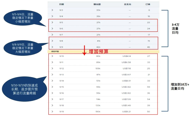 建议此时逐步提升预算,在流量呈现阶梯式上升的同时观察订单增长情况,逐步调整预算,当然预算的浮动与当期的节假日也有关联。