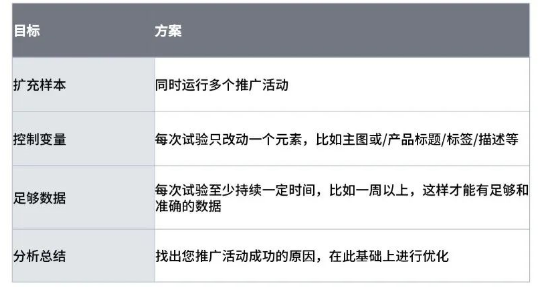 控制变量法是优化PB活动的有效方法,主要表现为对样本同时开展多个推广活动,每次实验仅测试一个变量,比如主图、listing标题、标签、描述等保持至少一周的实验时间,并总结每个变量的成功因素,最终将所有的变量的成功因素归总开展推广活动,总体提升产品的推广表现。