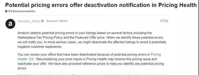通知写道,亚马逊一直在努力改进定价状况,会根据包括市场公平定价政策和特色报价来检测卖家listing中潜在的定价错误,而当亚马逊确定定价错误时,会发送通知给卖家。