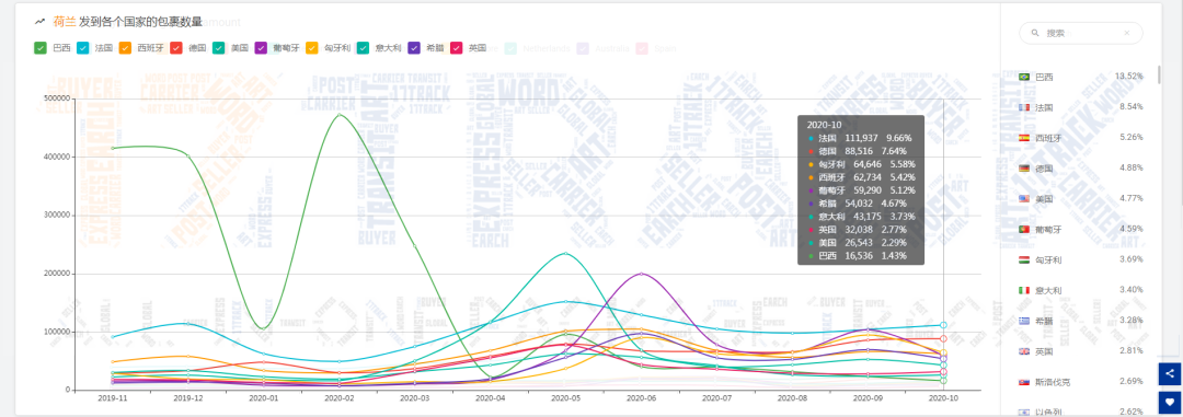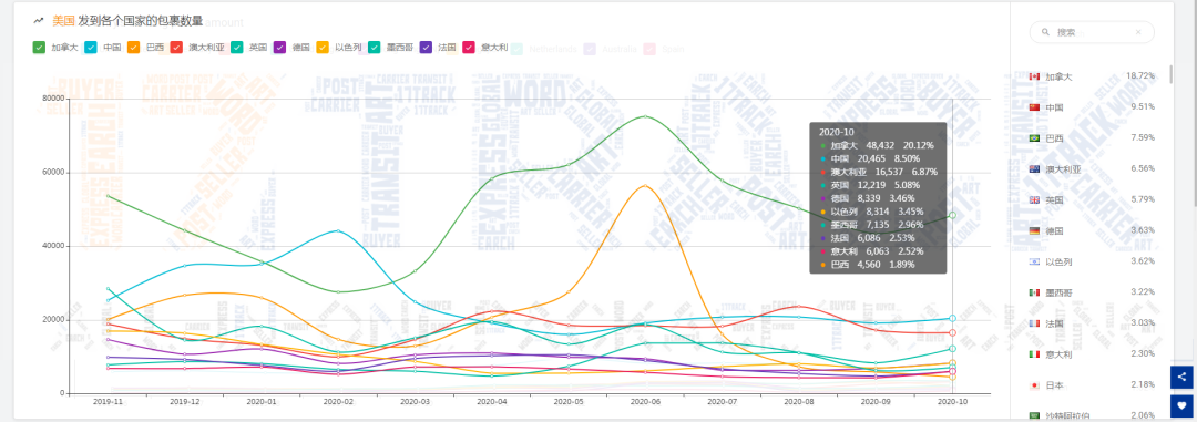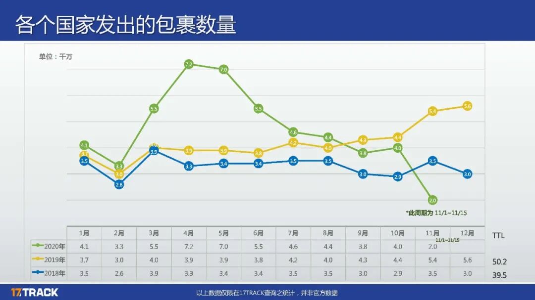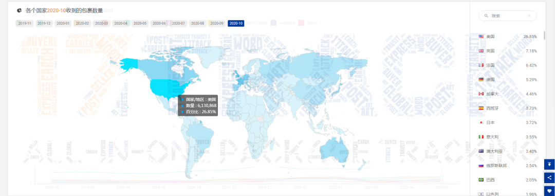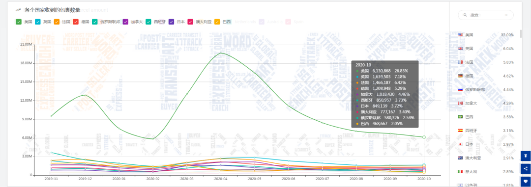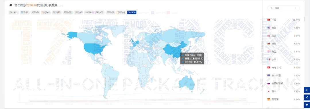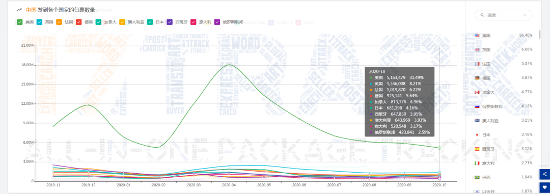 本期咱们回顾一下9月份的包裹数据:环比可以看到,10月份各个国家发出的包裹数量较9月份增加215万、涨幅为5.38%,在经历前连续四个月数量下降之后,终于回升了;同比较去年同期减少458万,降幅为10.29%;11月7日,海关总署发布了2020年10月全国进出口总值表,数据显示,10月,中国进出口总值达2.84万亿元,其中出口1.62万亿元,同比增长7.6%。2020年10月,平台总共收录查询单号超过3,990万票,其中发件的国家及地区为214个、收件的国家及地区为227个。