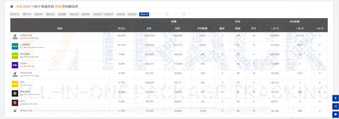 注:荷兰邮路发出的包裹前4的国家分别是法国占9.66%、德国7.64%、匈牙利5.58%、西班牙占5.42%,另外荷兰又重回发件国top5榜单疫情当下,各国全力抗击疫情的同时,积极回复生产生活秩序。截止11月30日的统计,10月份的包裹时效也陆续恢复正常;妥投率(取样)≠该渠道的全部妥投率取样[e邮宝]妥投率为34.23%,占比为36.86%注:平均时效16天,最慢44天;其中[异常数量]为10,611,占[发件]的0.68%取样[e邮宝]妥投率为37.17%,占比为25.62%注:平均时效16天,最慢44天;其中[异常数量]为1,675,占[发件]的0.71%