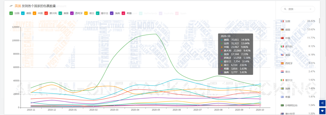注:德国邮路发出的包裹收件排名前4的国家是法国占20.87%、意大利占15.49%、英国占13.32%、西班牙占9.22%