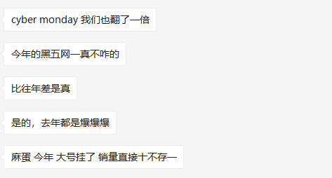 在刚刚过去的“黑五”大促中,不少卖家表示单量平平,甚至不增反降,过了个假的黑五。虽然黑五线上购物也有一定的促销活动,但线下商场的打折和优惠力度更大,因此不少国外消费者更倾向于线下购物,导致卖家单量上升幅度不大,这也能说的过去。