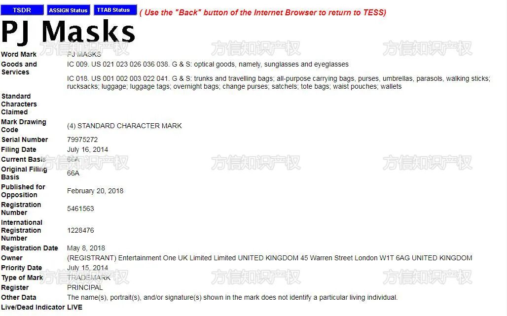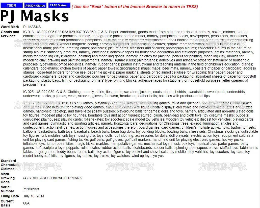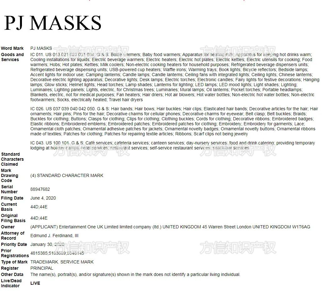 *PJMASKS 品牌方公司EntertainmentOne UK Limited 2020年6月新申请商标,与PJMASKS相关的只检索到这两个,目前尚未注册