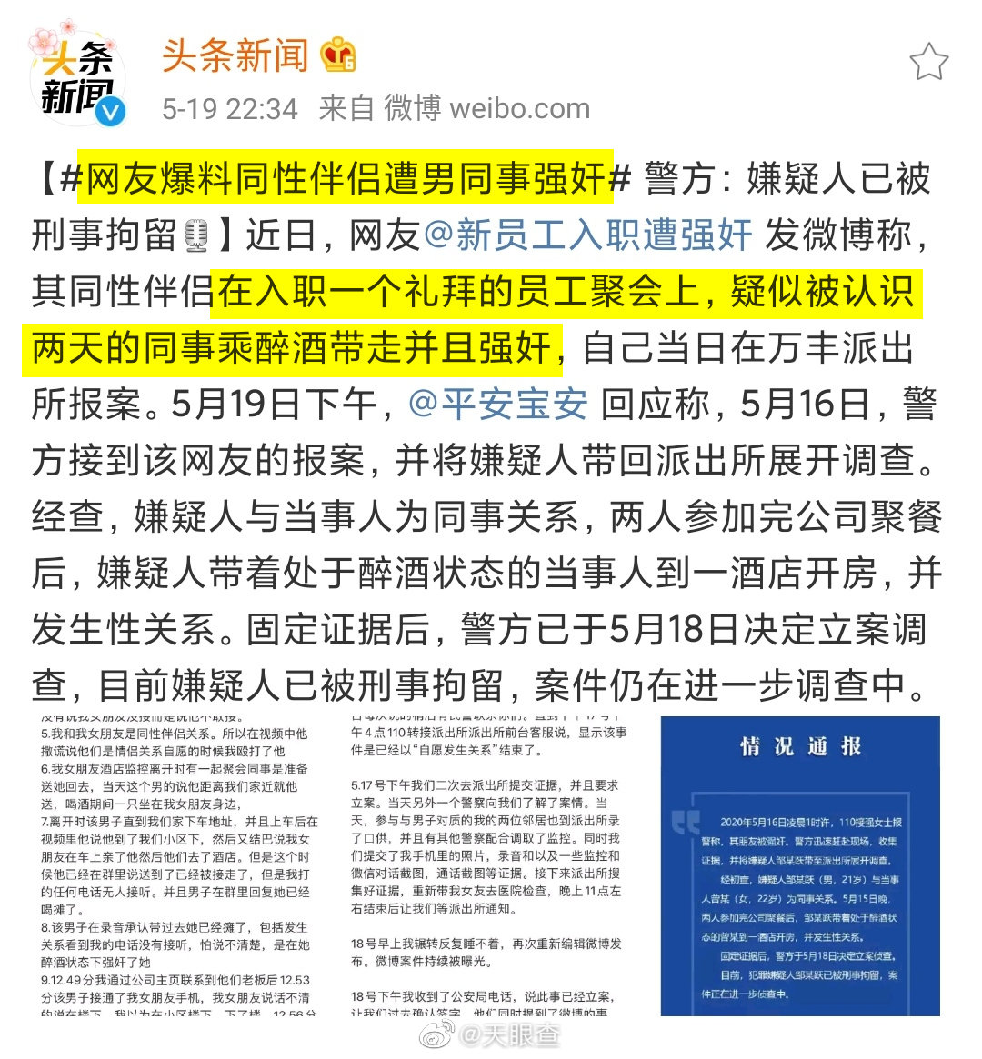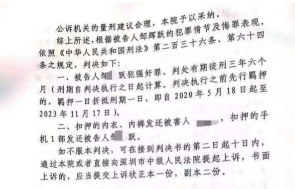 2020年5月,网友@新员工入职遭强奸发布微博称,其同性伴侣在入职一家国际物流公司一个礼拜后,在员工聚会上,疑似被认识两天的同事乘醉酒带走并且强奸。 ▲截图来自微博 5月19日,深圳市公安局宝安分局通报,5月16日凌晨1时许,110接强女士报警称,其朋友被强奸。警方迅速赶赴现场,收集证据,并将嫌疑人邹某跃带至派出所展开调查。 经初查,嫌疑人邹某跃(男,21岁)与当事人曾某(女,22岁)为同事关系。5月15日晚,两人参加完公司聚餐后,邹某跃带着处于醉酒状态的曾某到一酒店开房,并发生性关系。 固定证据后,警方于5月18日决定立案侦查。犯罪嫌疑人邹某跃被刑事拘留。6月2日,邹某跃被检方批捕。 ▲本案一审判决书 11月23日,宝安区人民法院对此案做出一审判决,被告人邹某跃犯强奸罪,判处有期徒刑三年六个月。![]()
