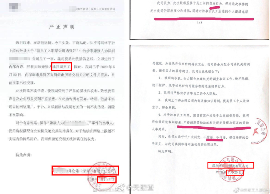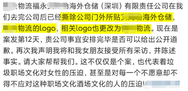 第9天即5月26日,A物流有限公司发布了道歉声明,并表示事发后公司积极安排休假和积极询问。随后受害人伴侣称,该份声明避重就轻,案发第五天去公司拿回受害人私人资料并且要求道歉时,当时的负责人仍然质问受害者为什么在网上散布舆论。