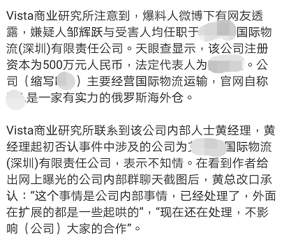 罪犯与受害人均任职于B国际物流(深圳)有限责任公司。据天眼查显示,该公司注册资本为500万元人民币,主要经营国际物流运输业务,官网自称是一家有实力的俄罗斯海外仓。